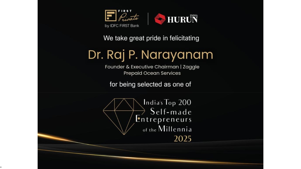 Mumbai (Maharashtra) [India], December 20: Dr Raj P. Narayanam, Founder & Executive Chairman of Zaggle Prepaid Ocean Services Limited (“Zaggle”), has been recognised as one of Hurun India’s Top 200 Self-Made Entrepreneurs of the Millennia 2025, a prestigious recognition celebrating India’s most influential founders who have built scalable, future-ready enterprises.